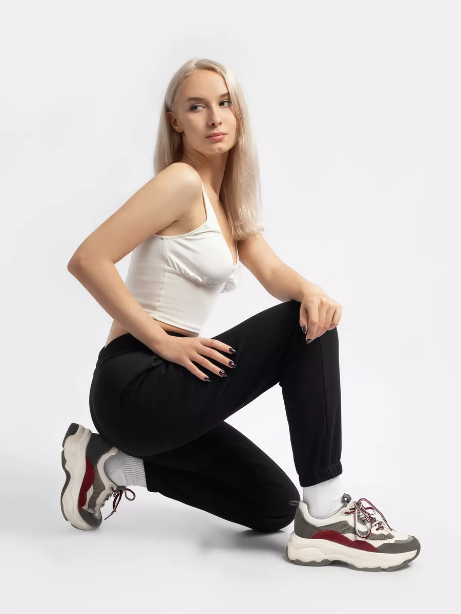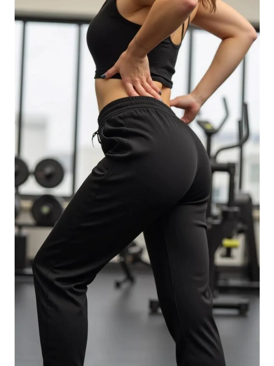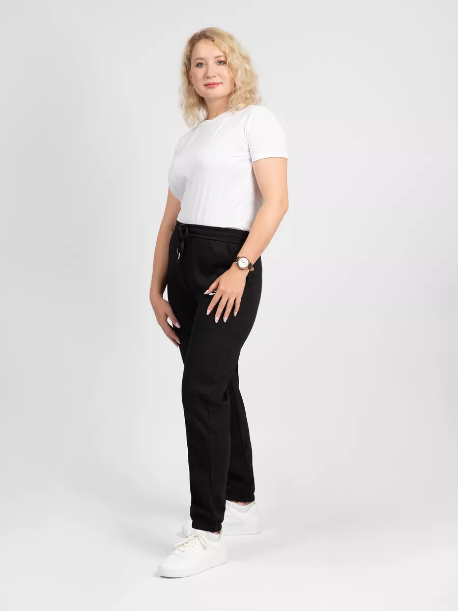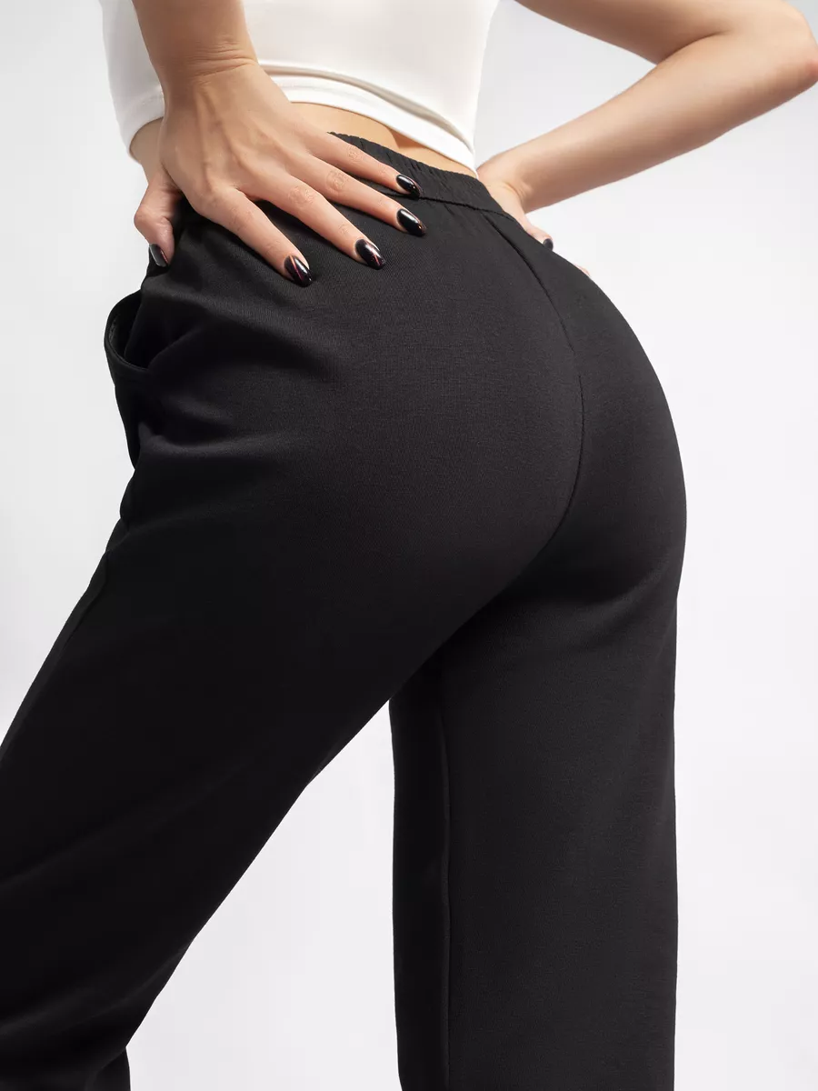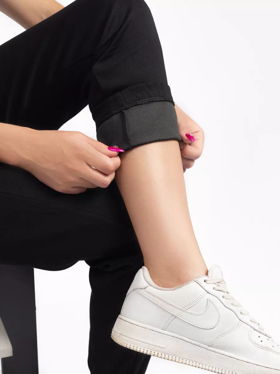 Классические черные штаны с манжетами по низу подчеркивают фигуру и создают аккуратный силуэт. Эластичный пояс на широкой резинке со шнурком обеспечивает комфортную посадку и практичность, поэтому брюки подходят и для тренировок, и для повседневного использования.