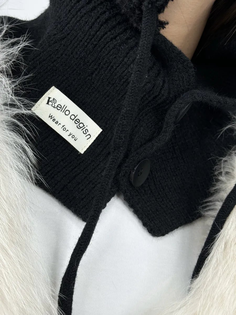 капор вязаный теплый с завязками манишка в рубчик,