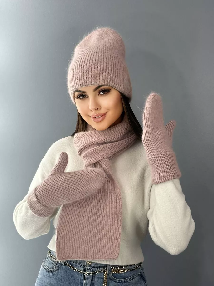 набор шапка меховая варежки ангора и шарф теплый вязаный