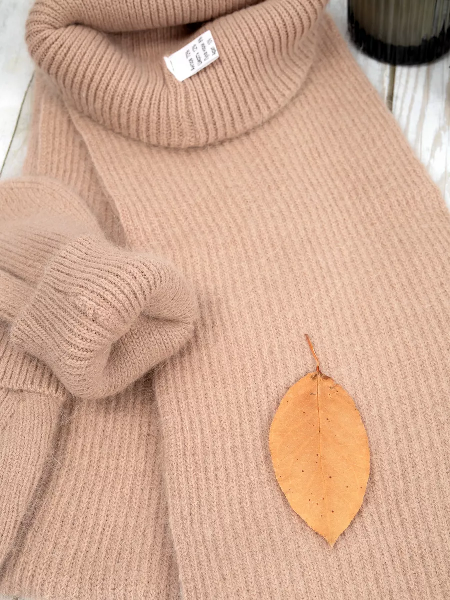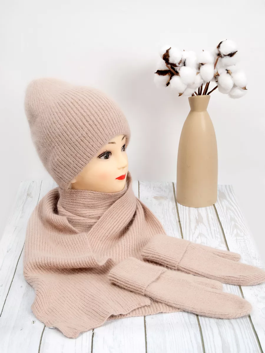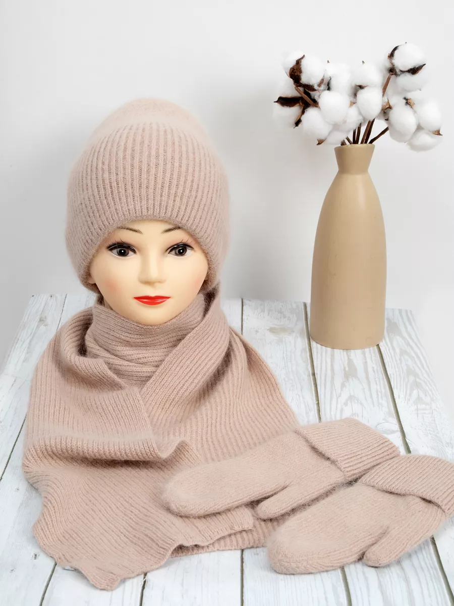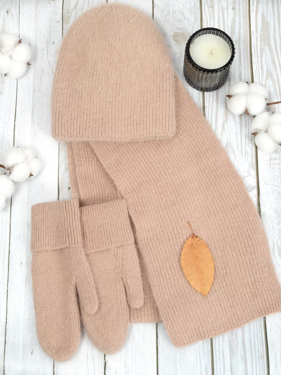 набор шапка меховая варежки ангора и шарф теплый вязаный