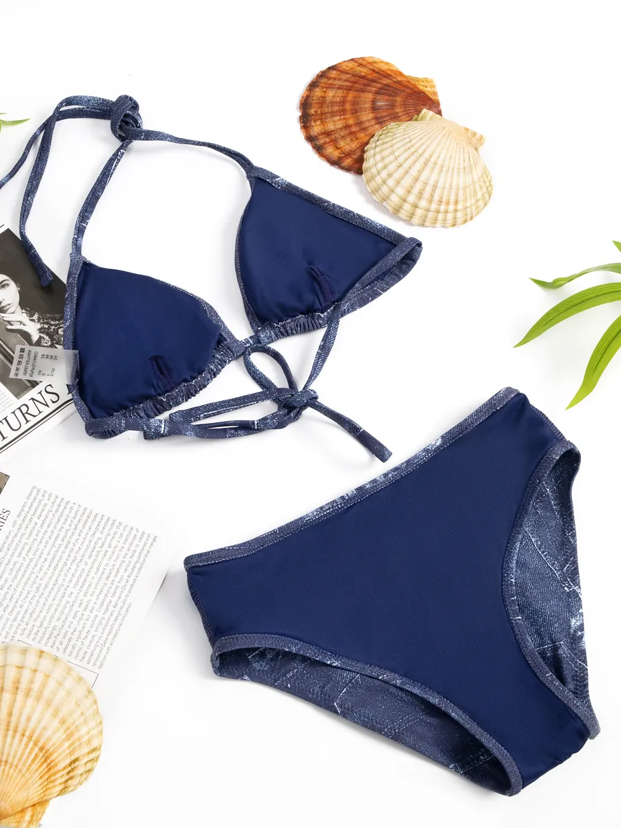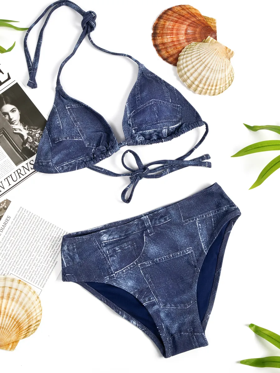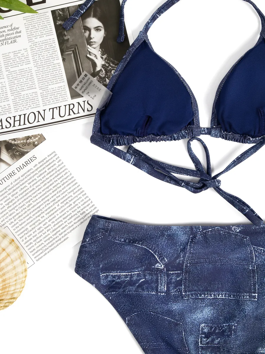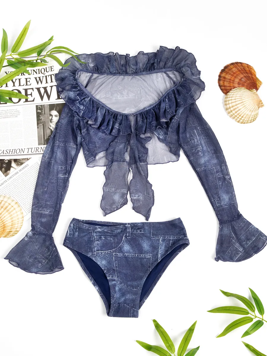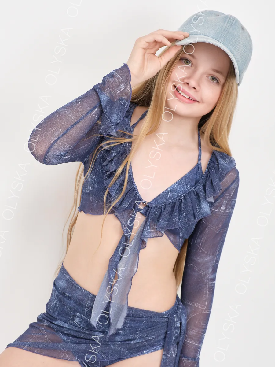 Раздельный купальник с модным принтом под джинсу и лёгкой накидкой — это стиль, комфорт и защита от солнца в одном комплекте. Купальник легко регулируется завязками и подходит как для пляжного отдыха, так и для занятий плаванием.