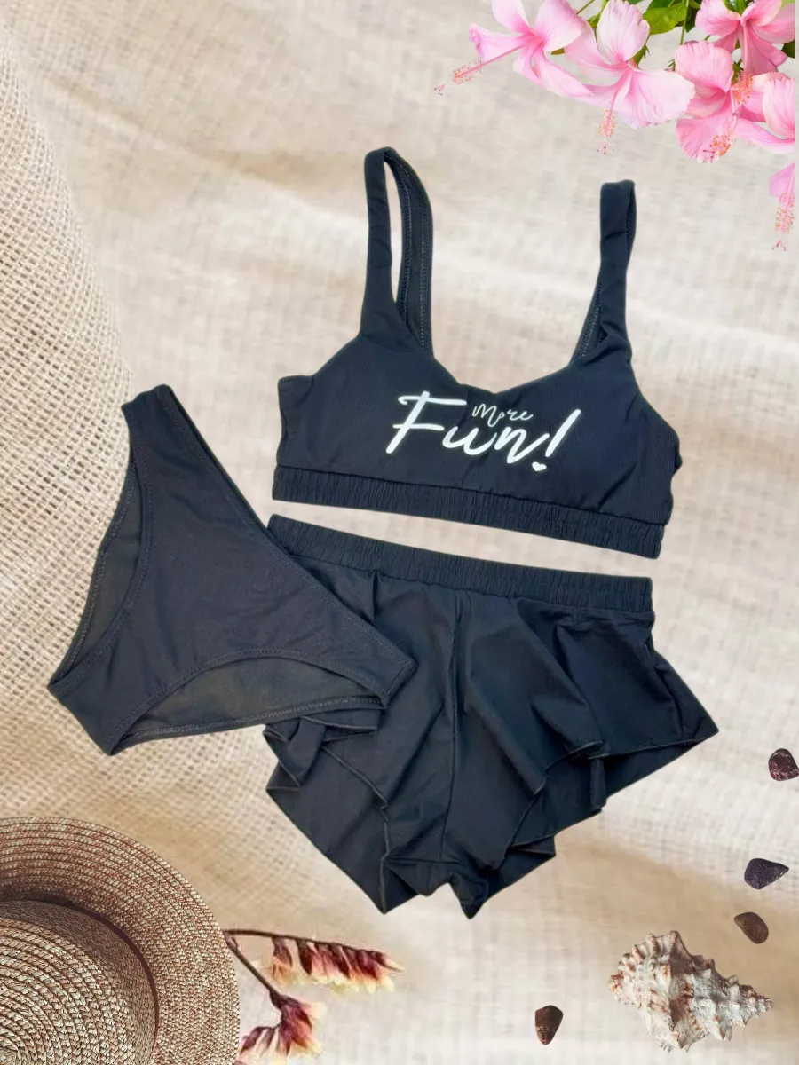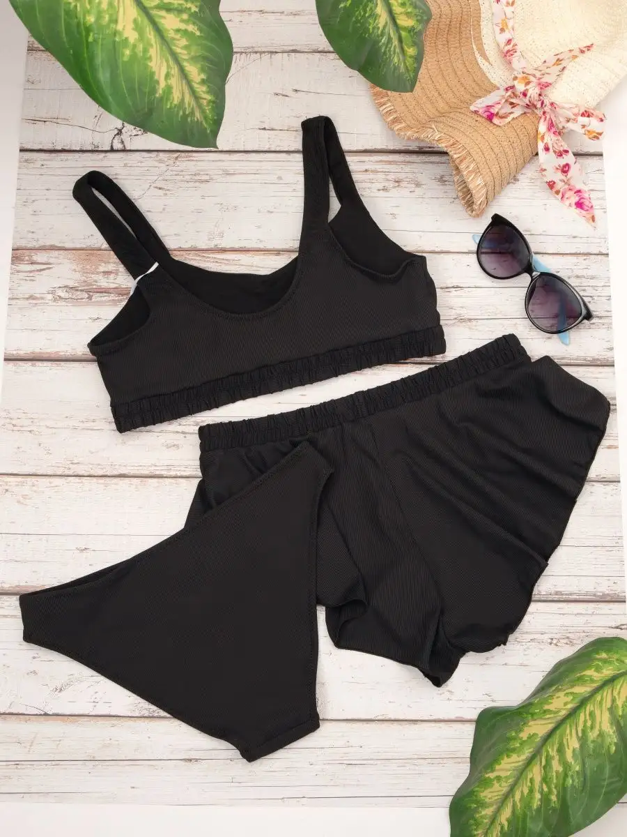 Женский купальник 3 в 1 с шортами и топом Prey From God — универсальный комплект для плавания, моря, бассейна и активного отдыха. В набор входят три предмета: топ, шорты и классические трусики. Можно носить вместе или по отдельности, создавая удобные образы для пляжа, спорта или отдыха.