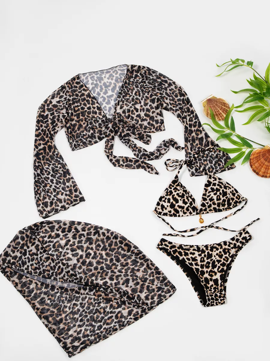 Этот женский пляжный наряд состоит из 2-х частей: верхней и нижней, что позволяет вам создать уникальный образ и подчеркнуть свои достоинства. Верхняя часть состоит : лиф на завязках и кроп топ парео леопардовый, а низ состоит : парео юбка с трусами для бассейна.