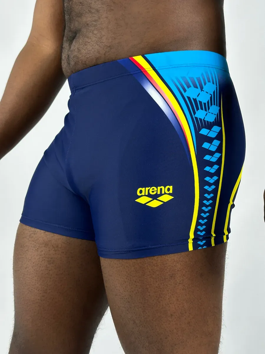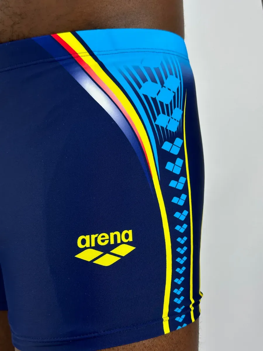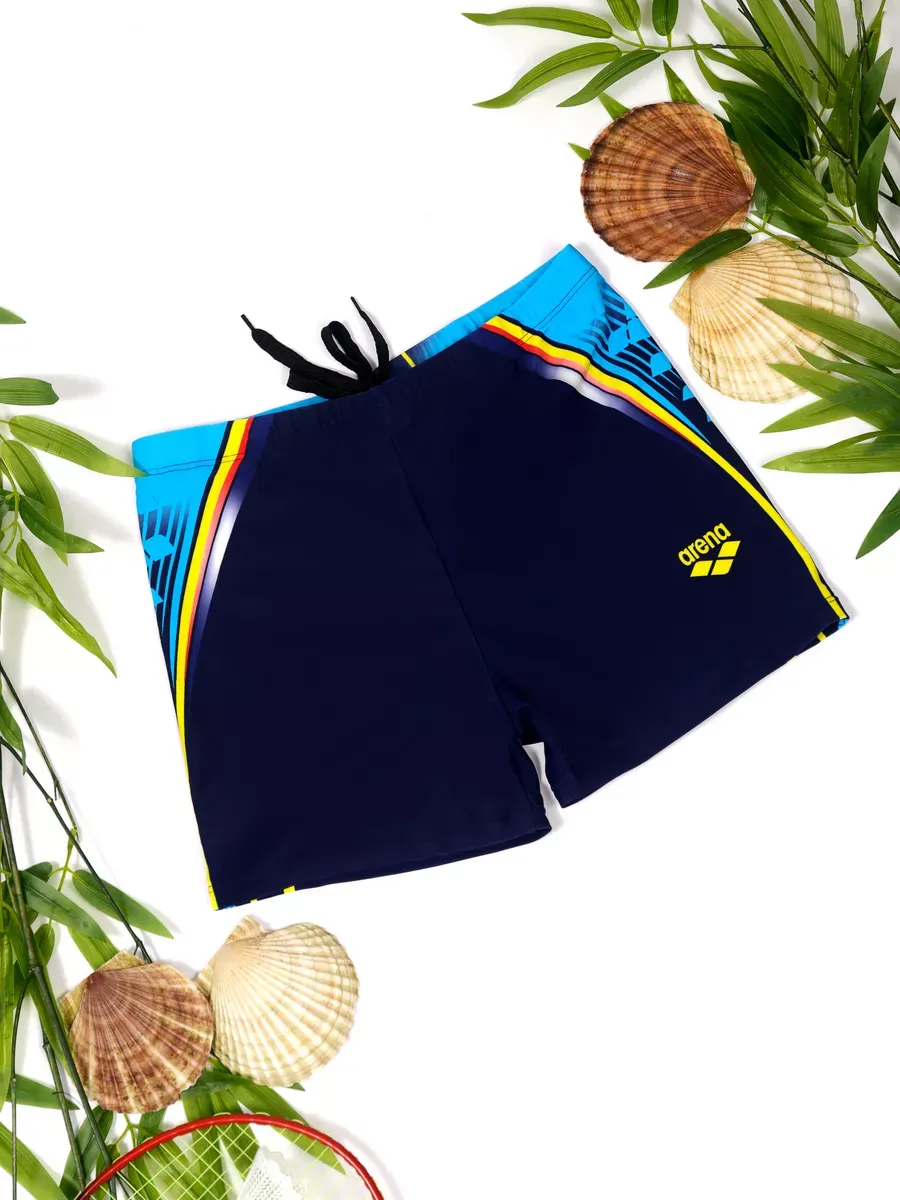 Представляем мужские плавки-боксеры arena – идеальный выбор для всех, кто ценит комфорт и стиль. Эти купальные трусы выполнены в глубоком синем цвете, эффектно отличающемся от классических черных моделей, и украшены ярким принтом сбоку. Стильный принт с элементами логотипа Арена добавляет динамичности, превращая их из однотонных шорт в спортивные плавательные боксеры.
