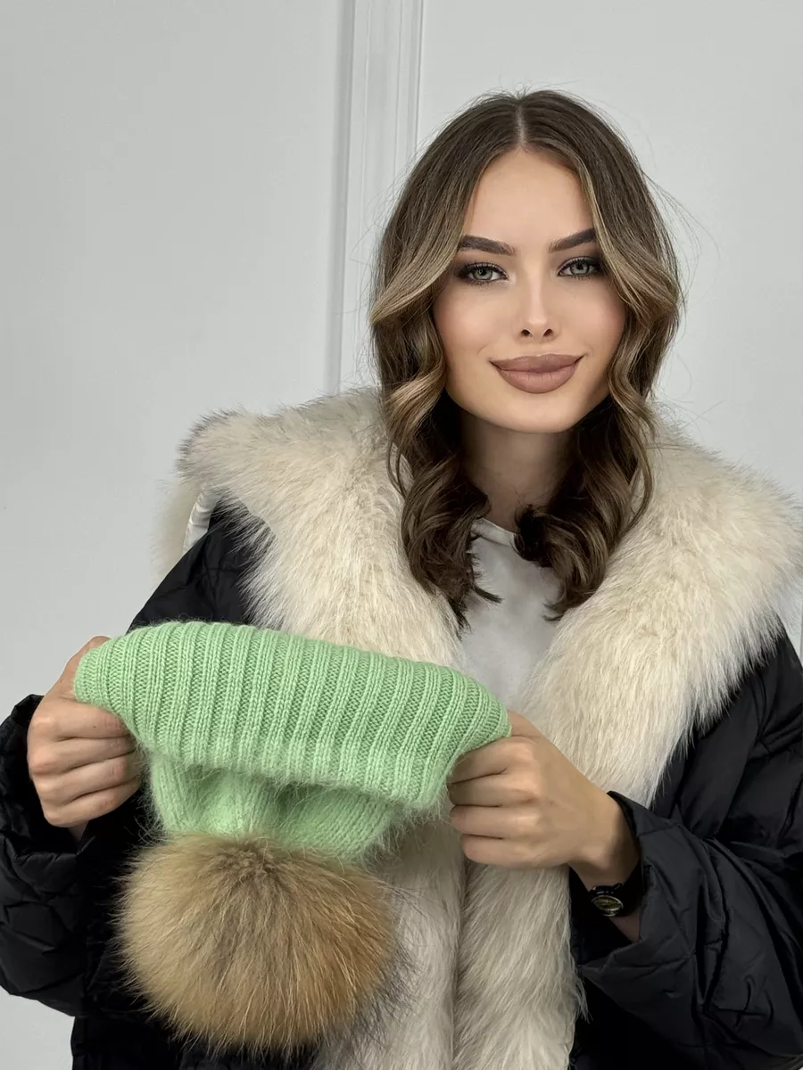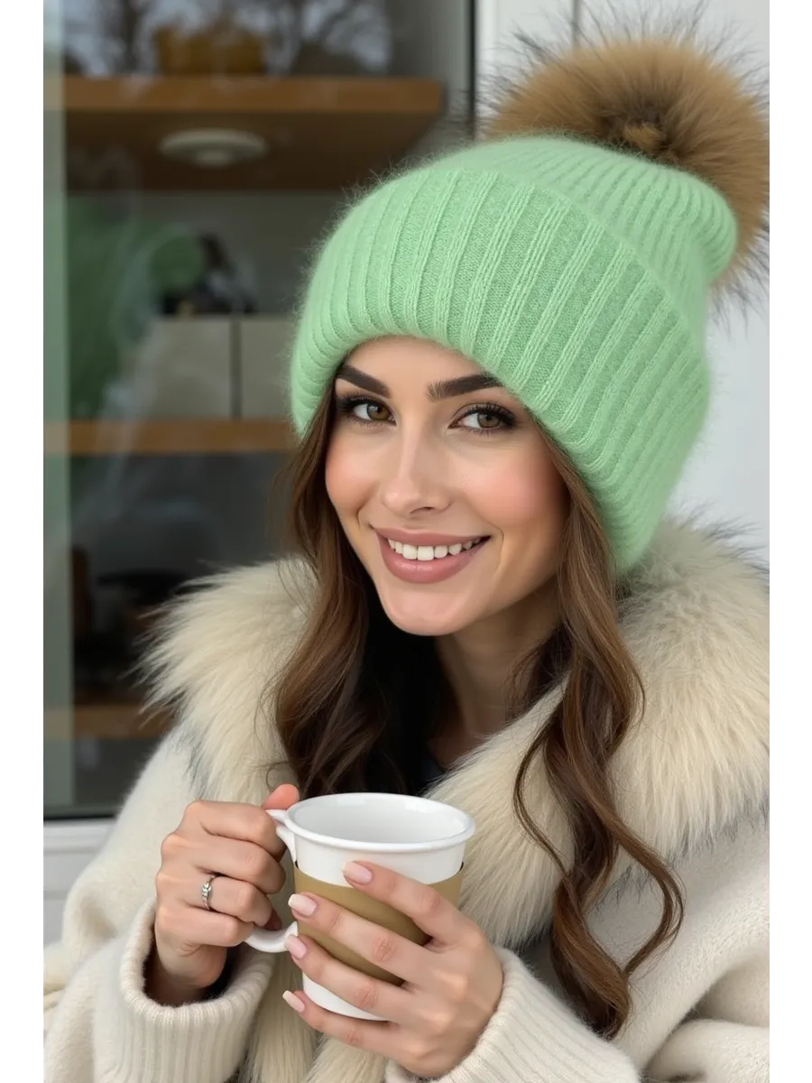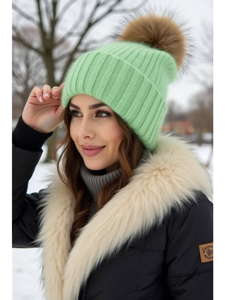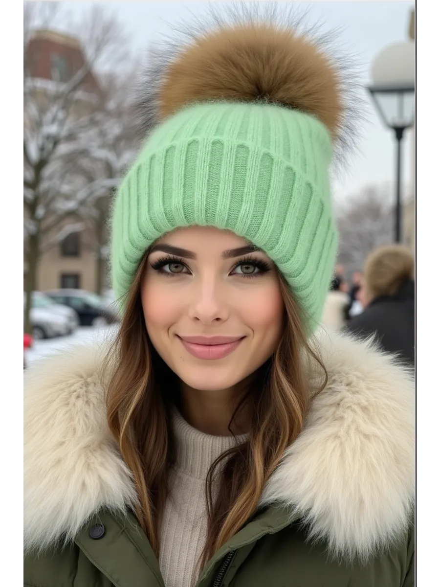 Пушистый меховой помпон придаёт образу игривости и женственности, делая шапку идеальным аксессуаром для зимнего сезона.