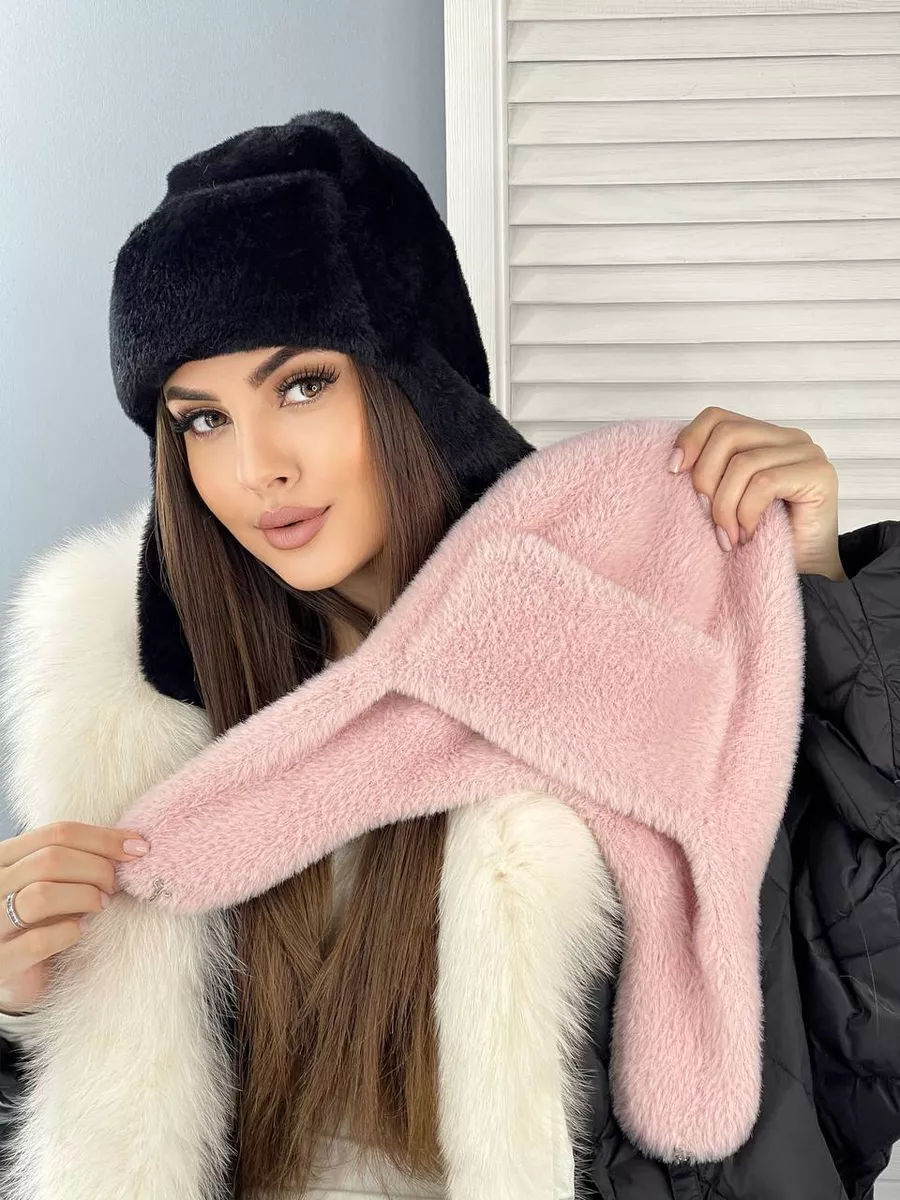 Форма “ушанка” остаётся в моде уже несколько сезонов подряд. Удлинённые ушки можно завязать под подбородком, оставить свободно или аккуратно закинуть назад — как вам удобно.