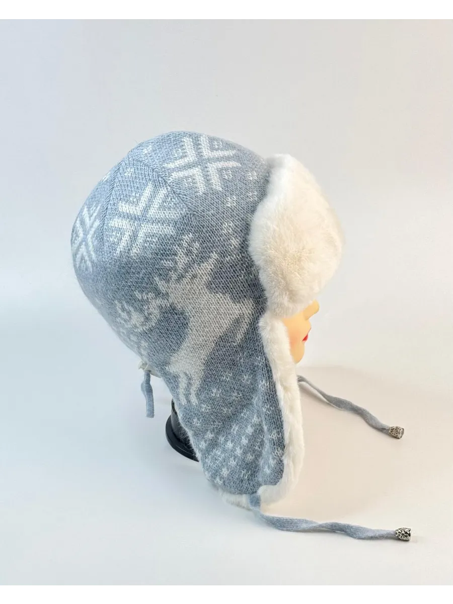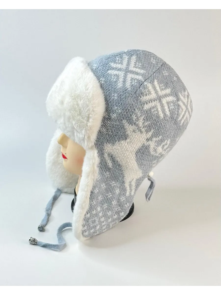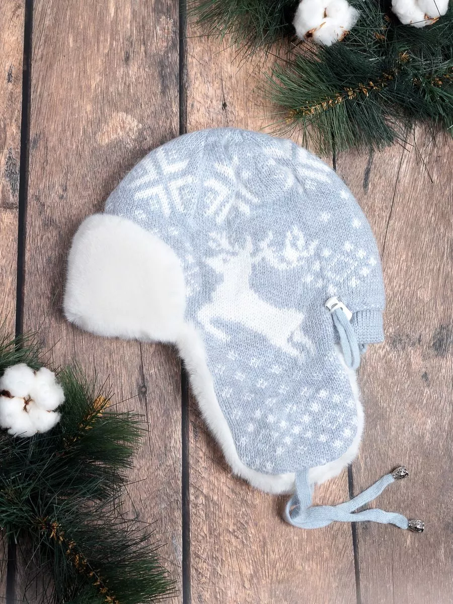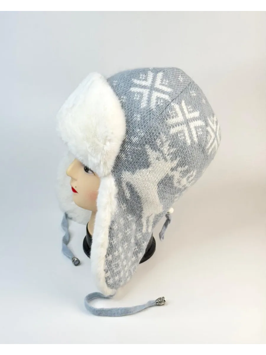 Стильная женская зимняя шапка-ушанка серого цвета с белым мехом и скандинавским узором станет вашим незаменимым аксессуаром в холодное время года. Модель выполнена из мягкой вязаной ткани с рисунком «олени и снежинки», дополнена пушистой меховой отделкой и завязками для удобной фиксации.