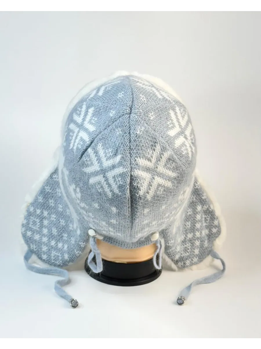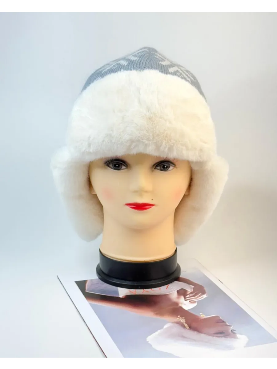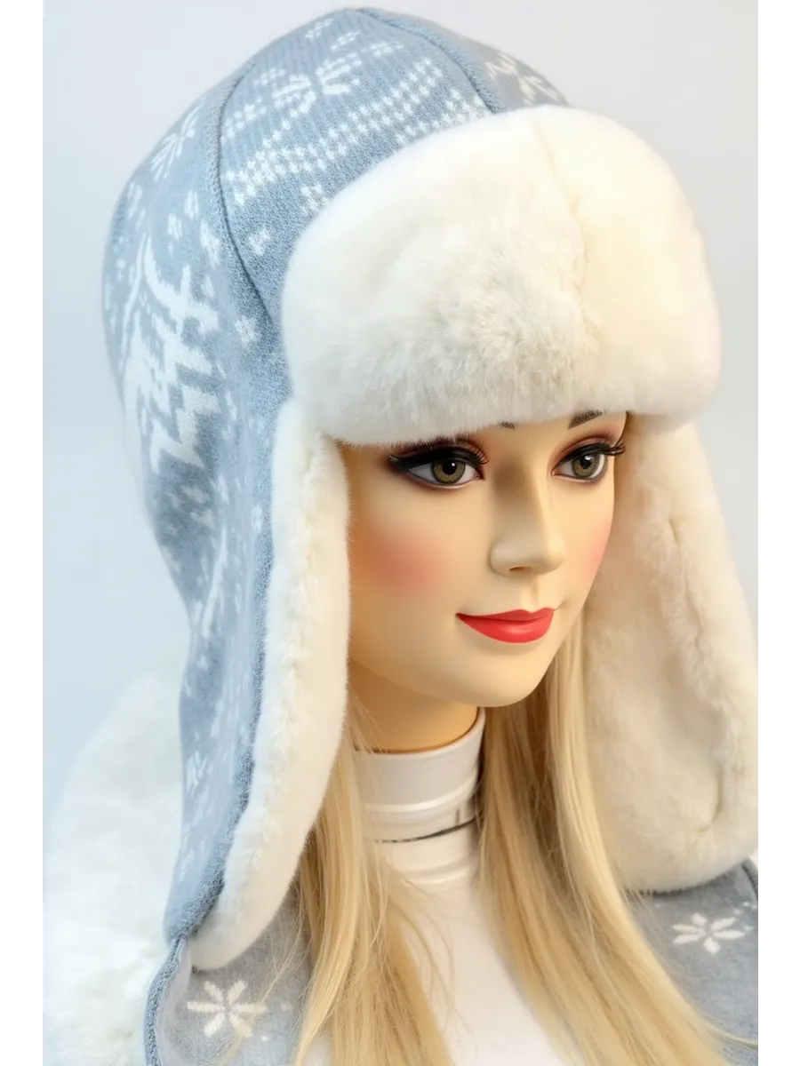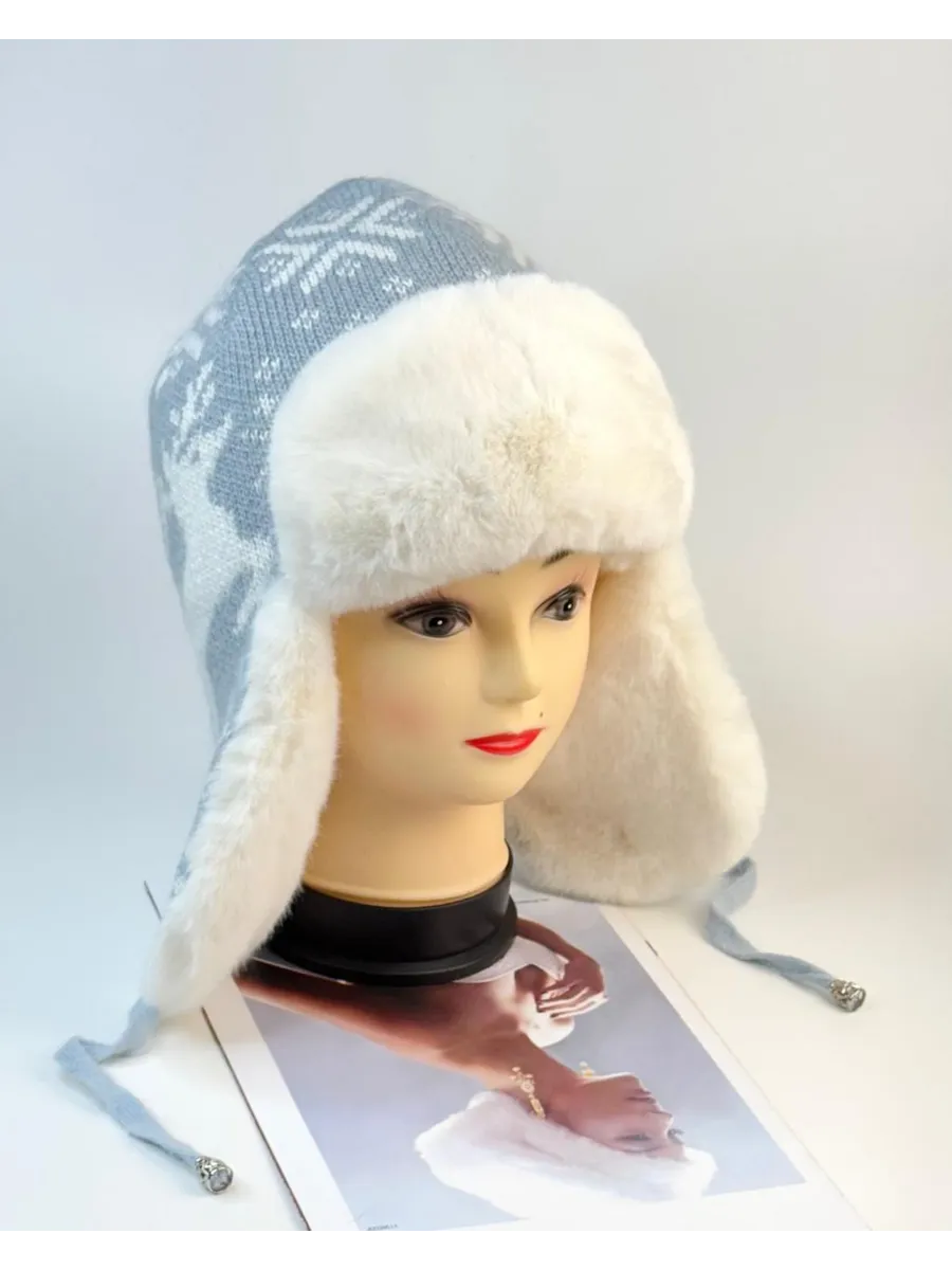 Стильная женская зимняя шапка-ушанка серого цвета с белым мехом и скандинавским узором станет вашим незаменимым аксессуаром в холодное время года. Модель выполнена из мягкой вязаной ткани с рисунком «олени и снежинки», дополнена пушистой меховой отделкой и завязками для удобной фиксации.