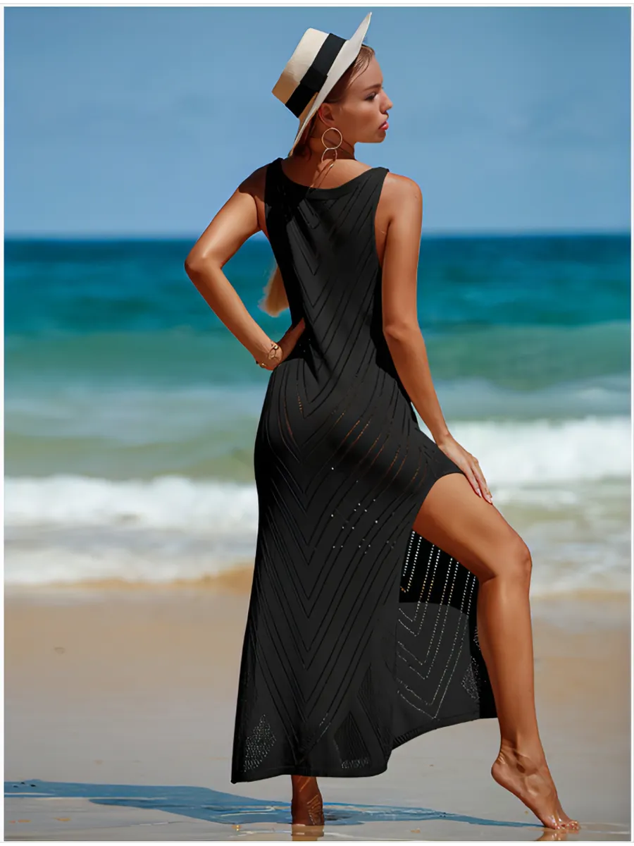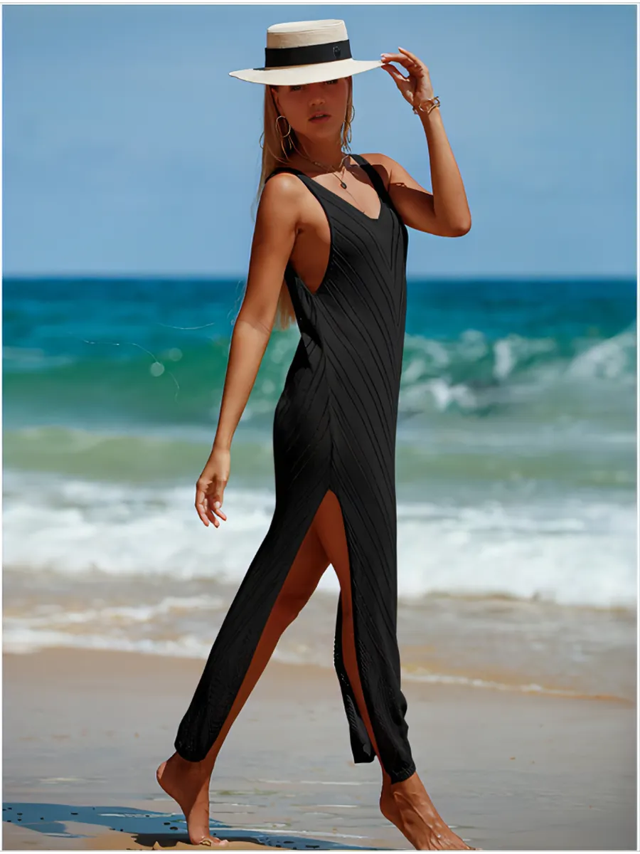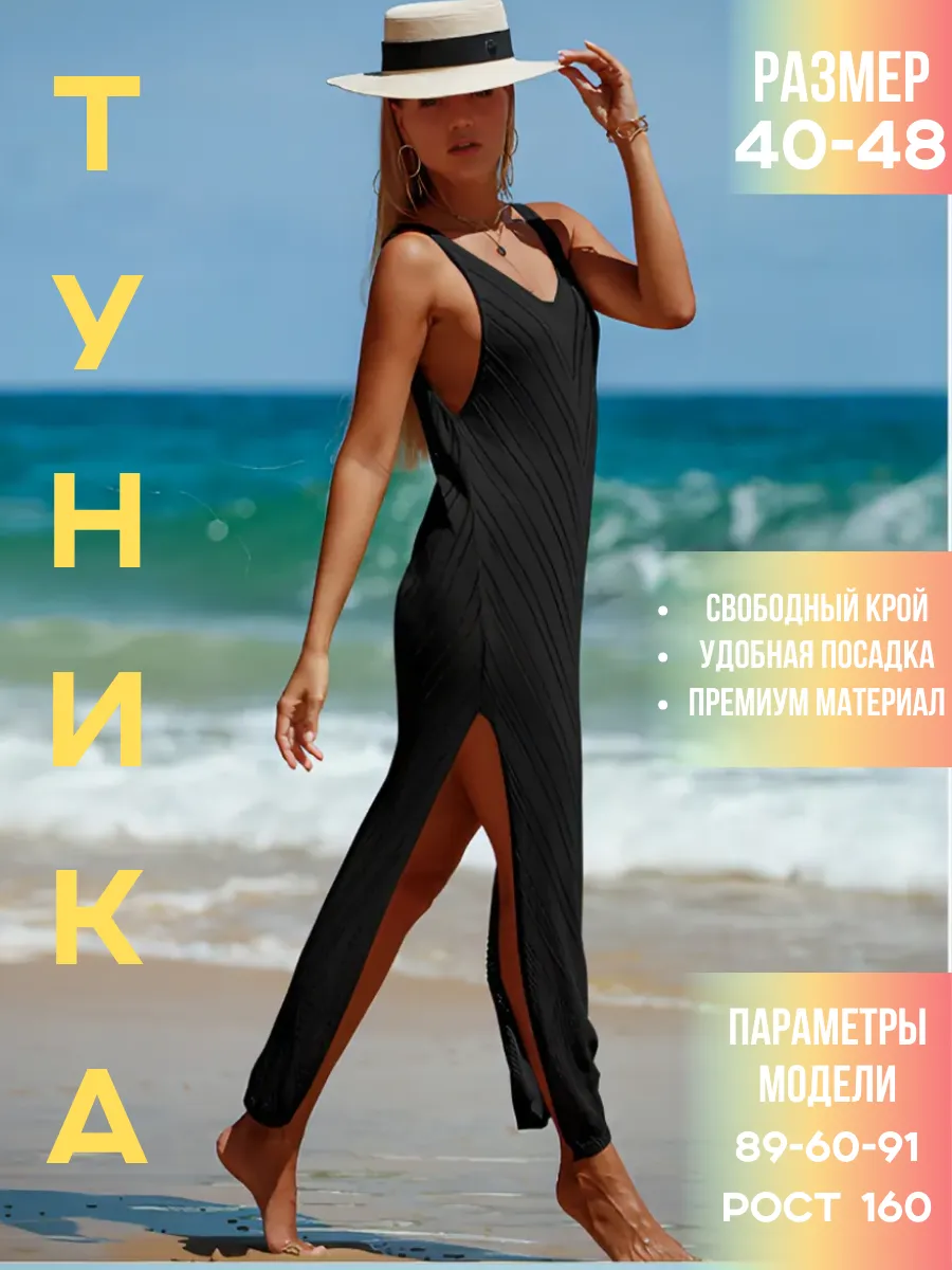 Свободный крой и эффектное длинное платье-накидка с высоким боковым разрезом подчеркнет вашу индивидуальность и позволит чувствовать себя уверенно. Это великолепное женское платье-майка идеально накинуть поверх купальника для прогулок по побережью или отдыха у бассейна. майку легко заменит традиционное парео, добавив образу элегантности.